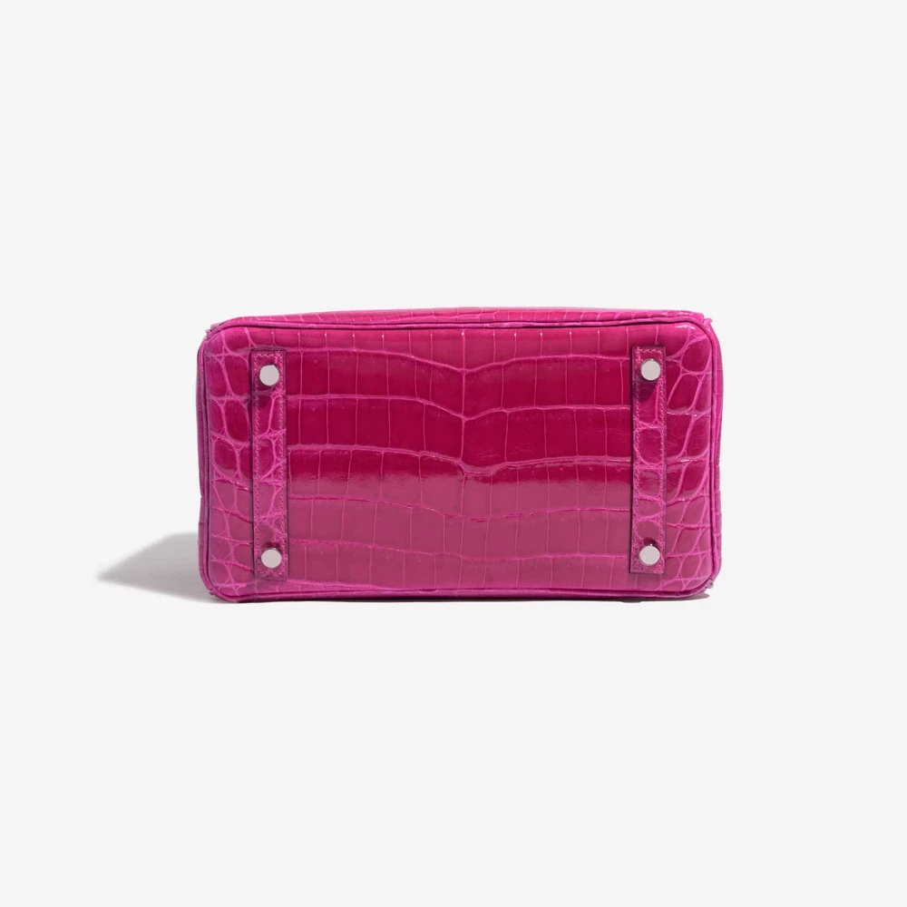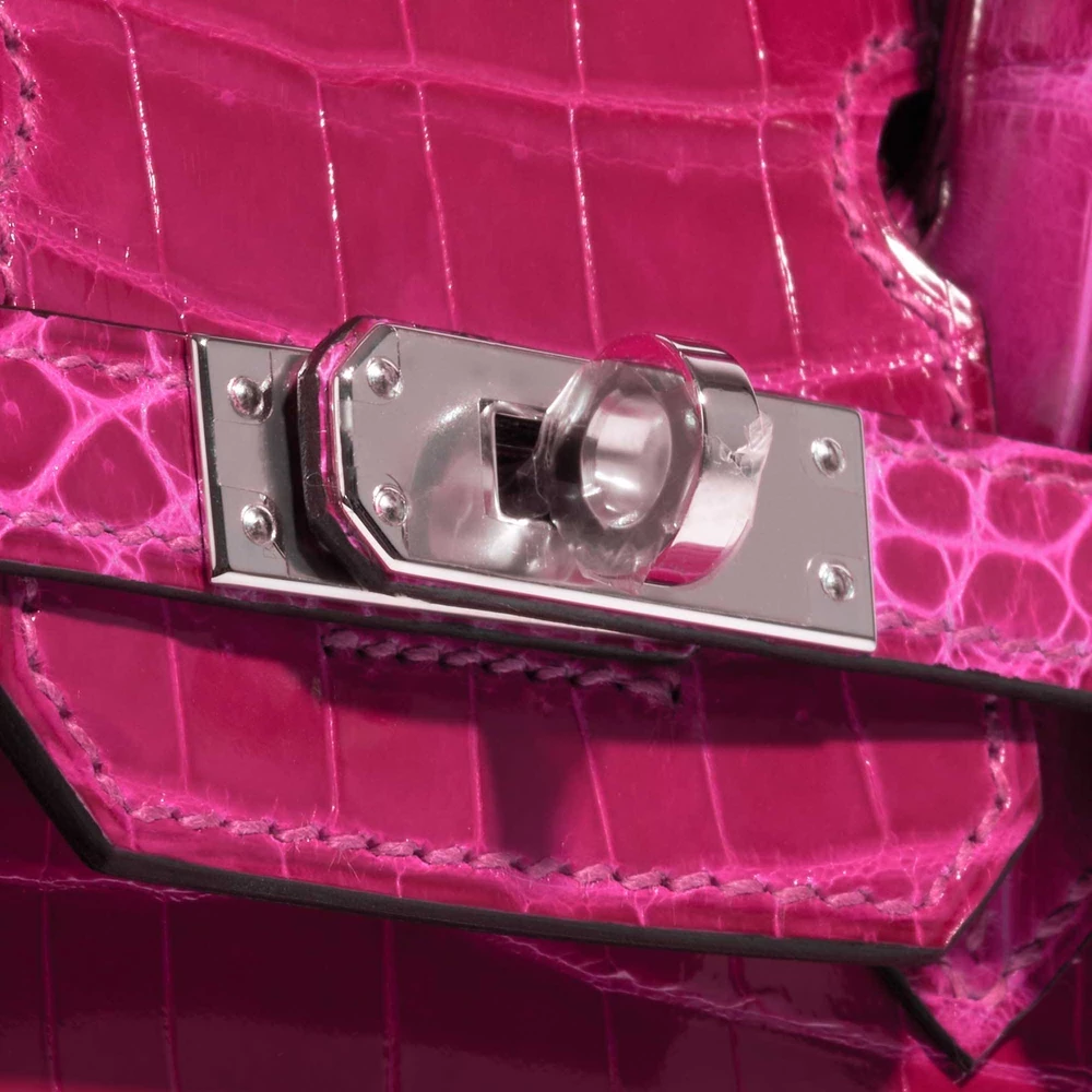This Hermès Artisan-Grade Birkin 25 features luxurious Niloticus Crocodile Rose Pourpre leather for a rich and vibrant deep pink-purple exotic skin in a petite size with palladium hardware. Palladium hardware provides a modern and sleek finish. Perfectly sized to carry your phone, wallet, and more. Niloticus Crocodile is highly prized for its smaller and more defined scales. Carry it by the top handles or on your arm for a chic and opulent statement. Ideal for evenings out and special occasions.