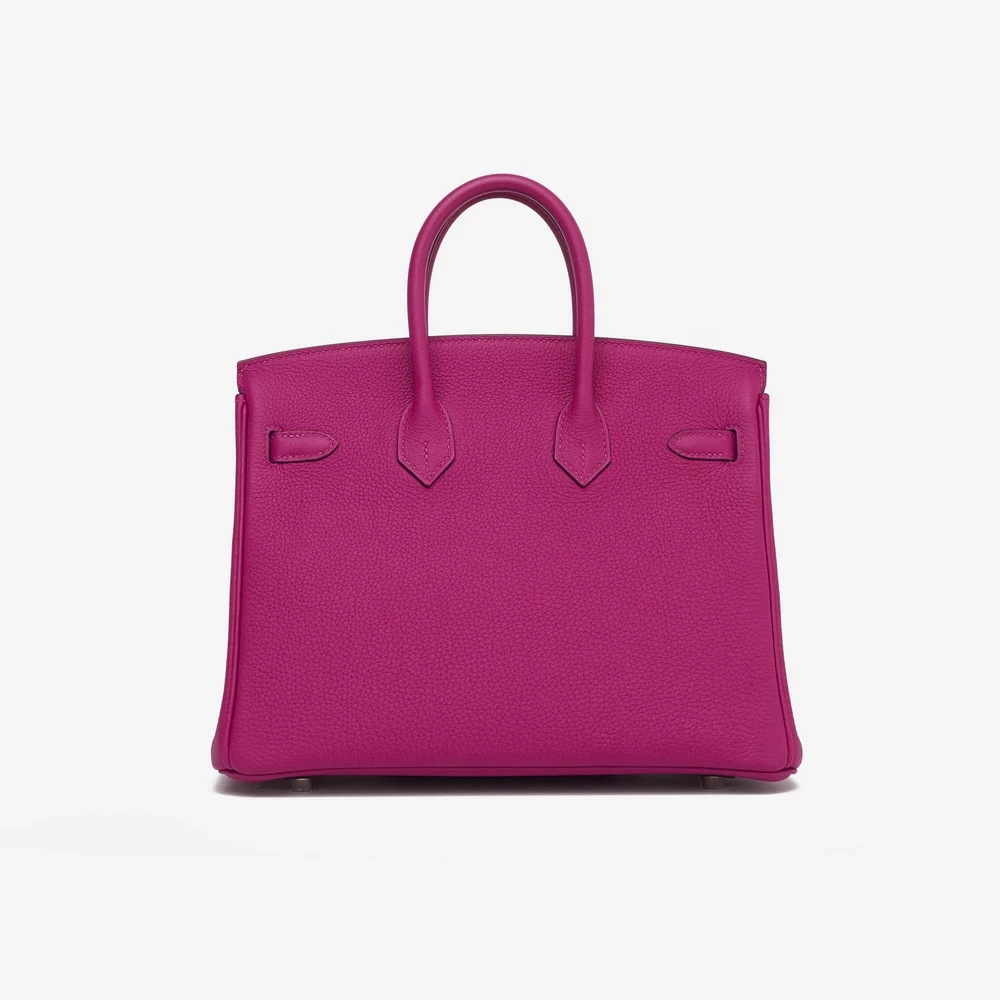 This Hermès Artisan-Grade Birkin 25 features Togo Rose Pourpre leather for a rich and vibrant deep pink in a petite size with palladium hardware. Palladium hardware provides a modern and sleek finish. Perfectly sized to carry your phone, wallet, and more. Togo leather is durable and has a lovely, natural grain. Carry it by the top handles or on your arm for a chic and bold pop of color. Ideal for evenings out and adding a touch of vibrant elegance.