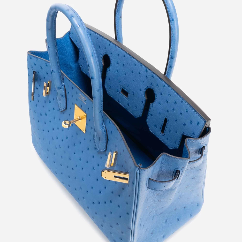 This Hermès Artisan-Grade Birkin 30 features luxurious Ostrich Blue Mykonos leather for a vibrant and cheerful bright blue in a versatile size with gold hardware. Gold hardware adds a warm and classic touch. Spacious enough for daily must-haves like a tablet and cosmetics. Ostrich leather is known for its distinctive quill pattern. Carry it by the top handles or on your arm for a chic and bold pop of color. Ideal for work and everyday elegance.
