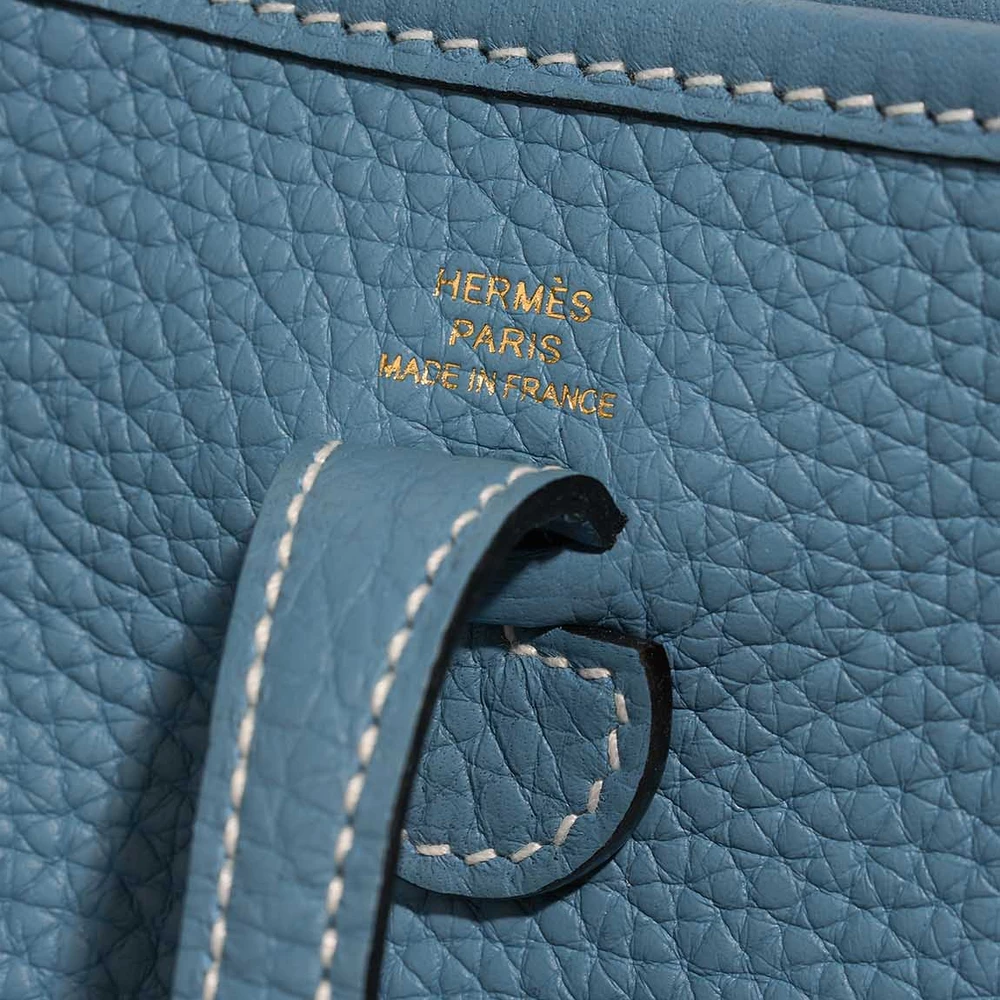 This Hermès Artisan-Grade Dupes Evelyne 16 features Taurillon Clemence New Bleu Jean leather for a fresh and stylish light blue denim shade. Gold hardware adds a warm and classic touch. Perfectly sized to carry your phone, wallet, and more. Taurillon Clemence leather is soft and durable for everyday use. Wear it across your body for a hands-free and stylish way to carry it. Ideal for casual outings and adding a touch of casual chic.