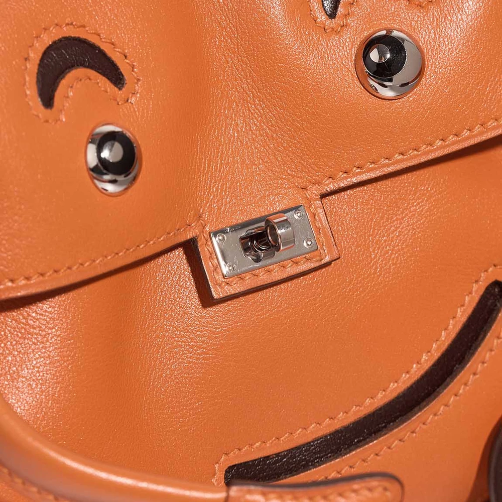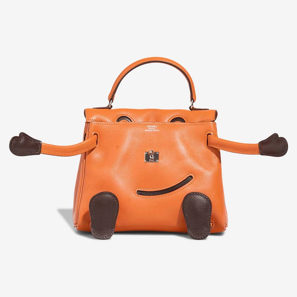 This Hermès Artisan-Grade Dupes Kelly Doll features Swift Orange H leather with brown accents for a playful and unique design. Palladium hardware provides a modern and sleek finish. Perfectly sized to carry your phone, wallet, and small essentials. Swift leather is smooth and shows vibrant colors beautifully. Carry it by the top handle or with the shoulder strap for a whimsical and stylish touch. Ideal for adding a fun and quirky element to your look.