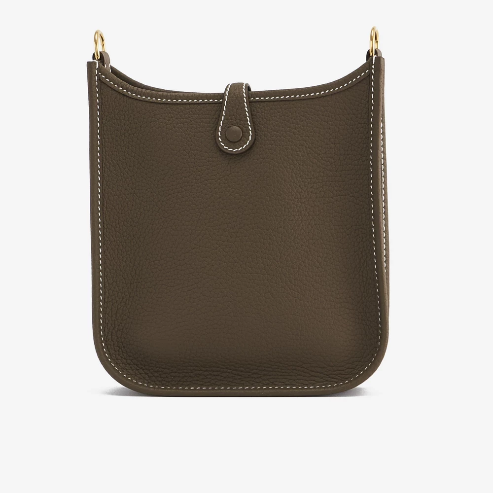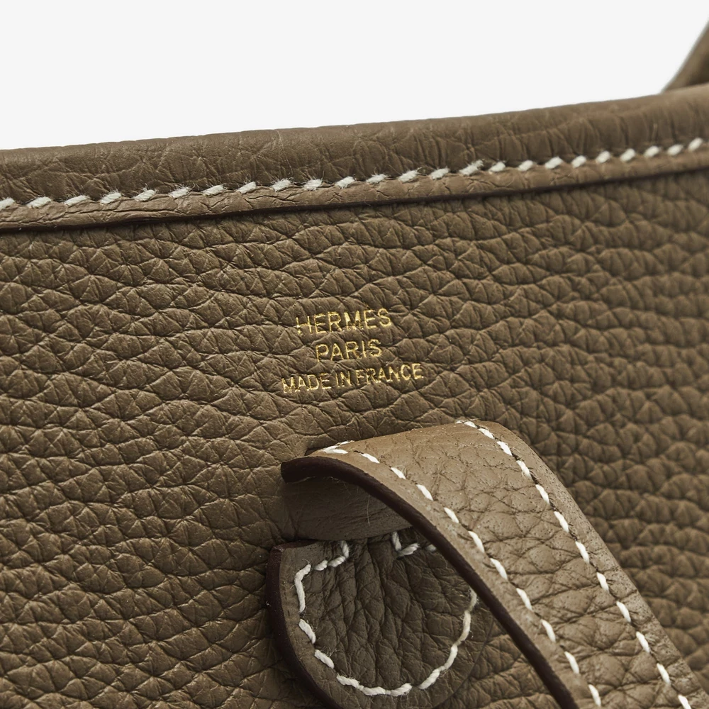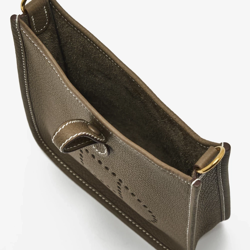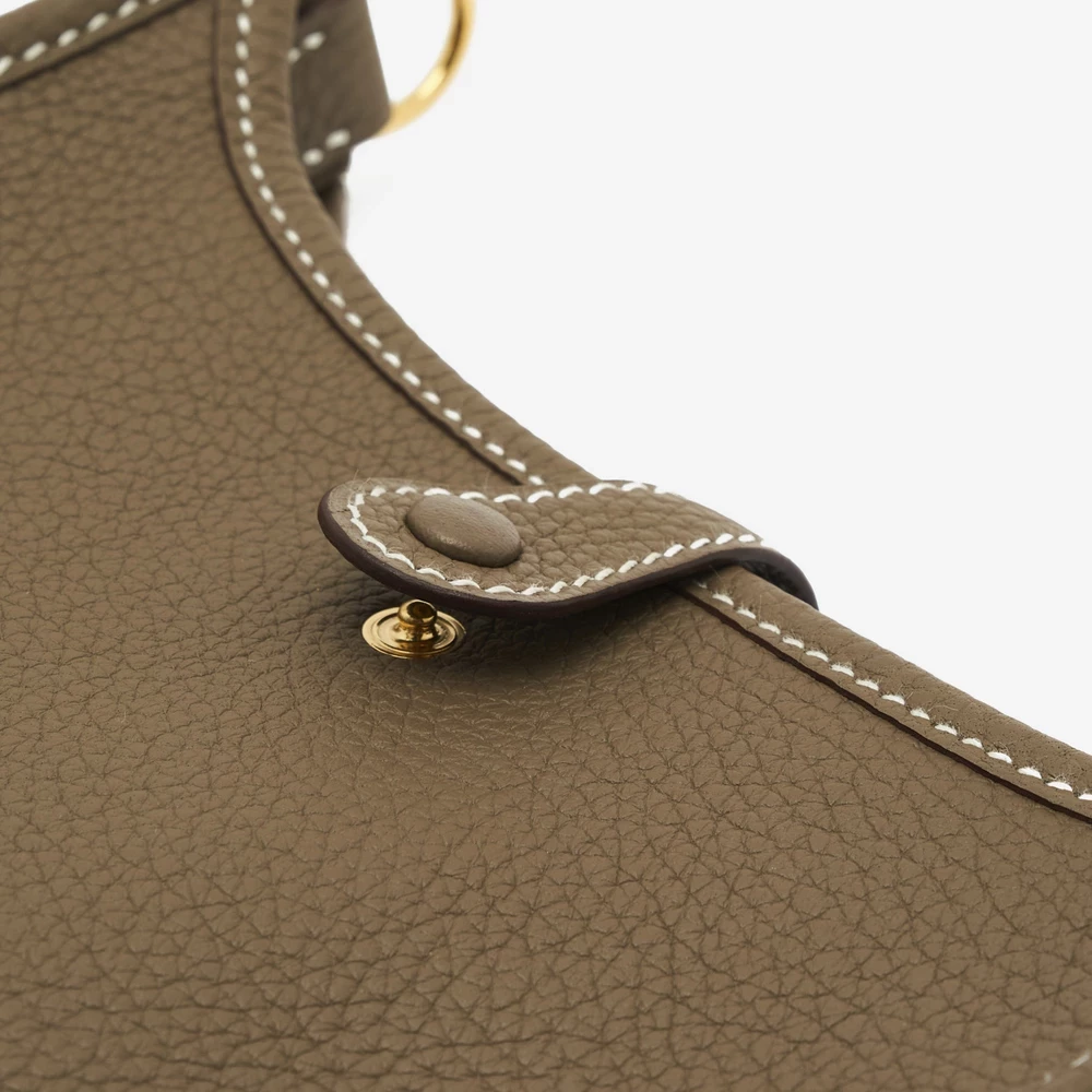 This Hermès Artisan-Grade Hermès Evelyne 16 “Amazone” edition features Taurillon Clemence Etoupe leather with a contrasting canvas strap in Bleu Indigo (deep navy) in a compact size with gold hardware. Gold hardware adds a warm and classic touch. Perfectly sized to carry your phone, wallet, and more. Clemence leather is soft and durable for everyday use, while the canvas strap adds a sporty touch. Wear it across your body for a hands-free and stylish way to carry it with a touch of classic chic. Ideal for casual outings.