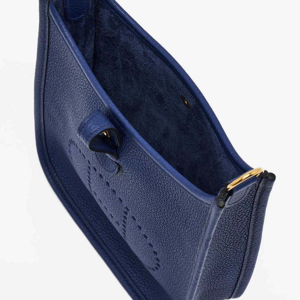 This Hermès Artisan-Grade Hermès Evelyne 16 “Amazone” edition features Taurillon Clemence Blue Sapphire (bright deep blue) leather with a contrasting canvas strap in Blue Indigo (deep navy) in a compact size with gold hardware. Gold hardware adds a warm and classic touch. Perfectly sized to carry your phone, wallet, and more. Clemence leather is soft and durable for everyday use, while the canvas strap adds a sporty touch. Wear it across your body for a hands-free and stylish way to carry it with a bold touch of color. Ideal for casual outings.