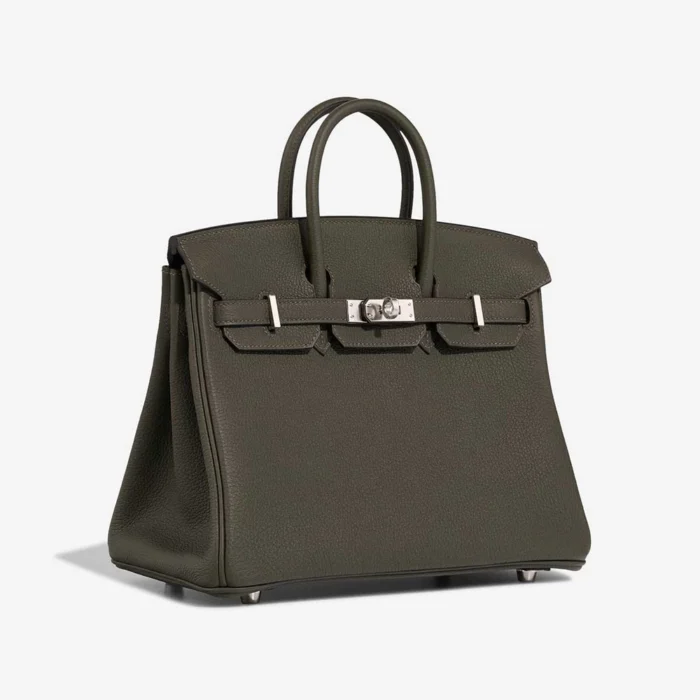 This Hermès High-End Inspired Birkin 25 features Togo Vert de Gris leather for a sophisticated and unique gray-green. Palladium hardware provides a modern and sleek contrast. Perfectly sized to carry your phone, wallet, and more. Togo leather is durable and has a lovely, natural grain. Carry it by the top handles or on your arm for a stylish and understated elegance. Great for adding a touch of subtle color to any outfit. Chic style in a refined neutral.