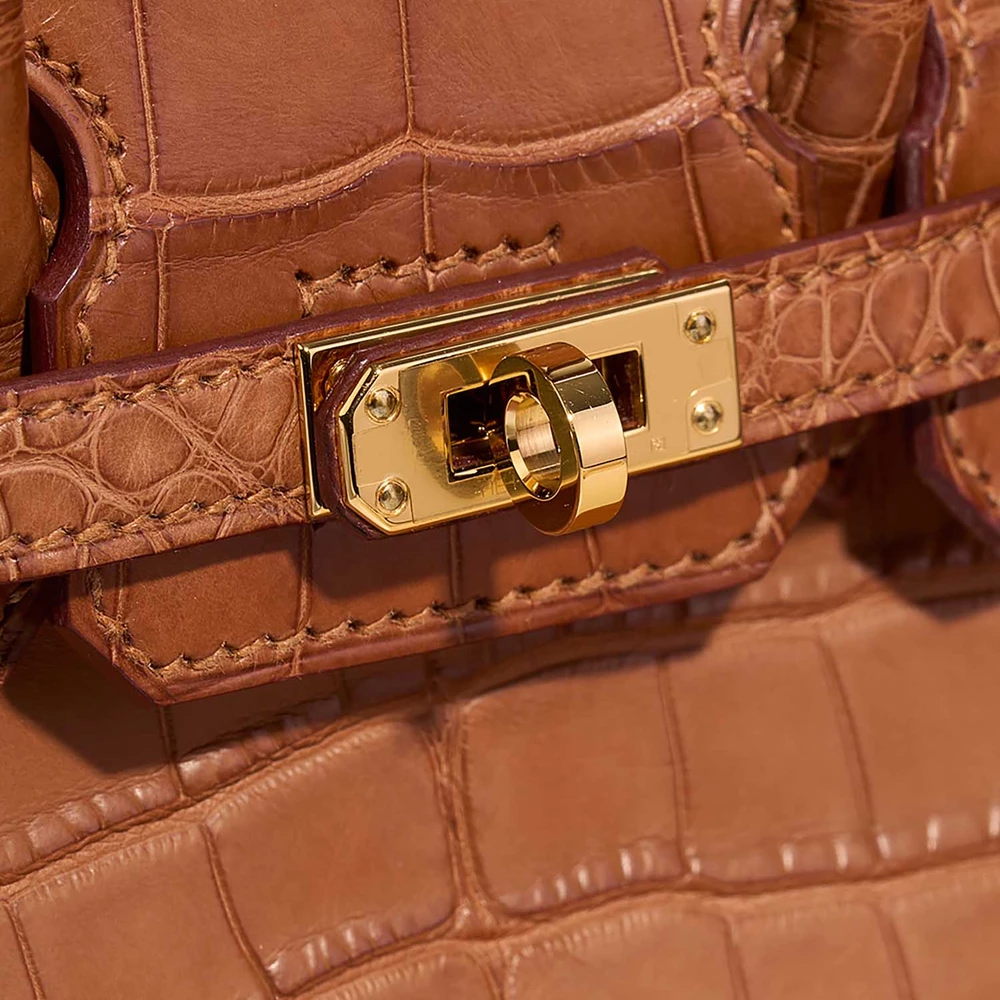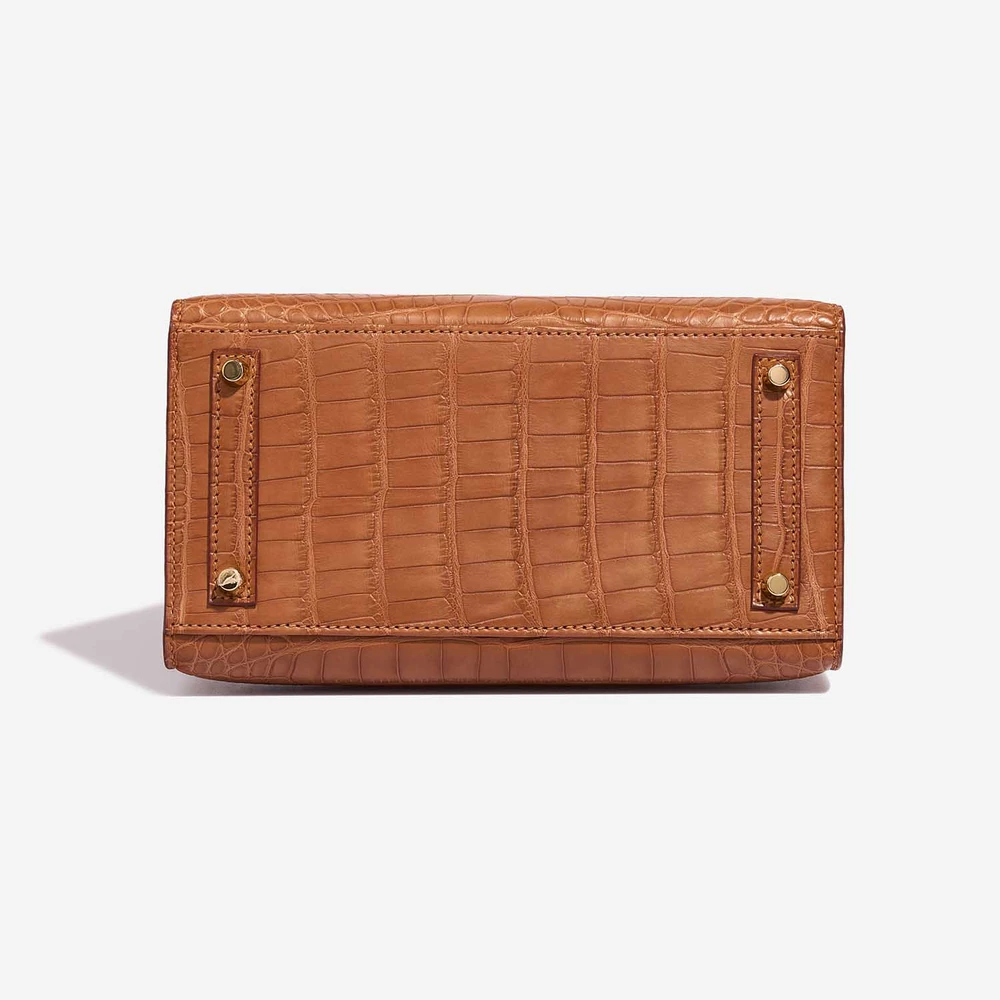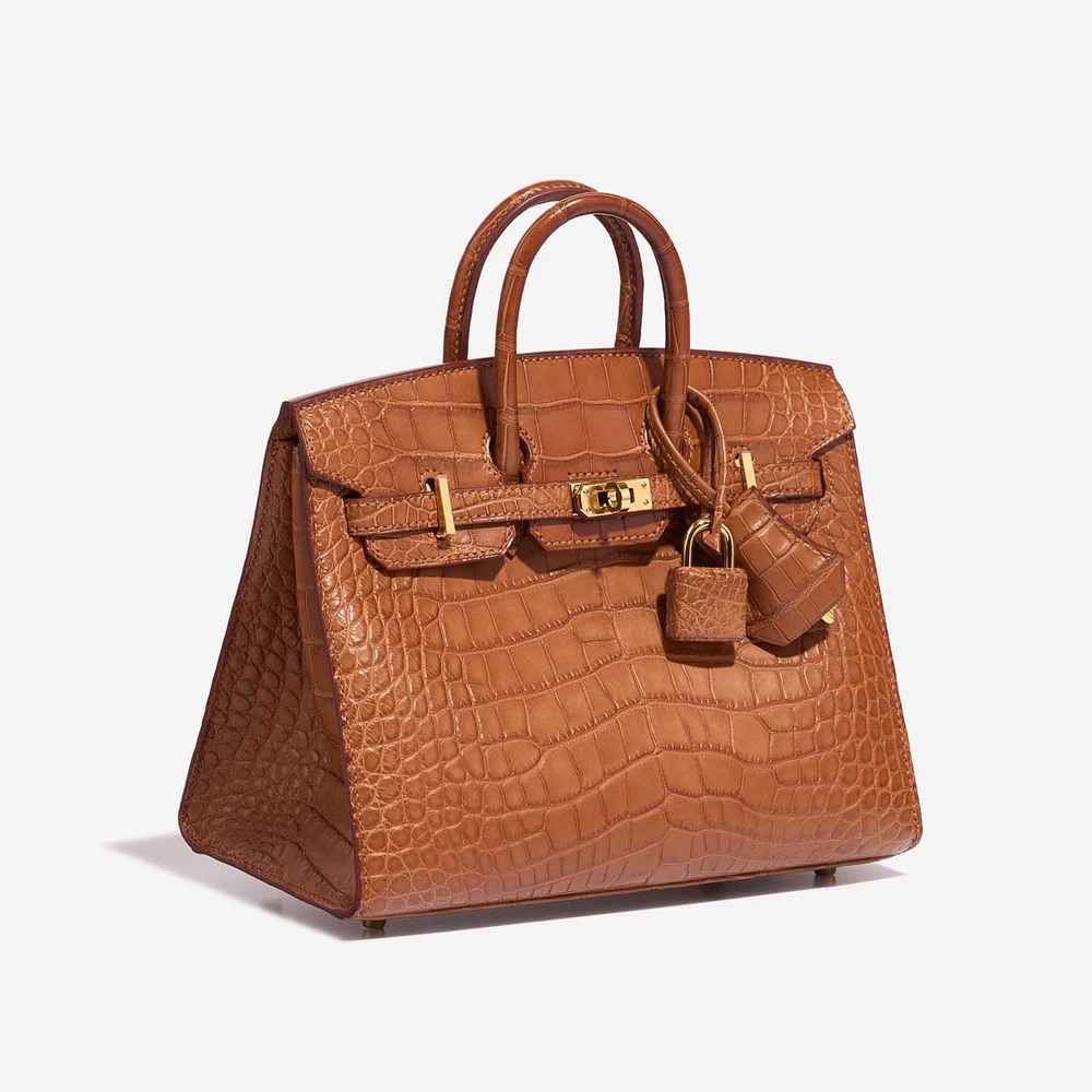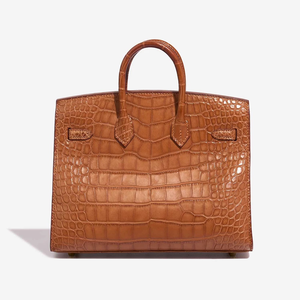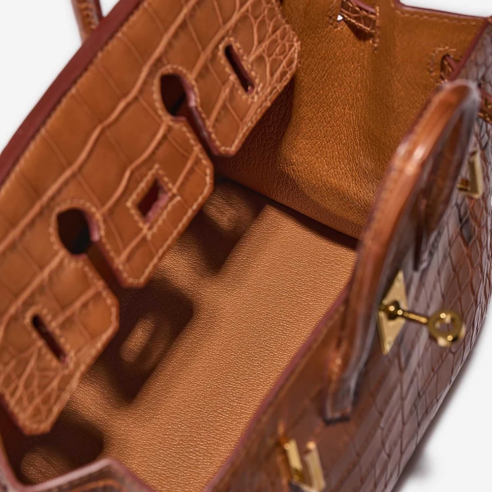 This Hermès High-End Inspired Birkin 20 features luxurious Alligator Mississippiensis Gold leather for a rare and elegant tan exotic skin in a very petite size (20cm). Gold hardware adds a warm and classic touch. Perfectly sized for just the essentials like a phone, small wallet, and lipstick. Alligator Mississippiensis is prized for its beautiful scales and smooth texture. Carry it by the top handles or on your arm for an ultra-luxurious and rare statement. Ideal for collectors and the most special occasions.