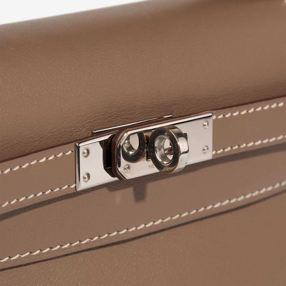 This Hermès-inspired Kelly Pochette uses Swift leather in Etoupe with palladium hardware for sleek minimalism. PHW elevates the flap closure and slim silhouette. Fits essentials like cards, keys, and a compact mirror. Smooth Swift leather resists scuffs and maintains structure. Match with tailored blazers or silk blouses for refined polish. Seamlessly transitions from office hours to evening dinners. Quiet luxury in neutral tones.