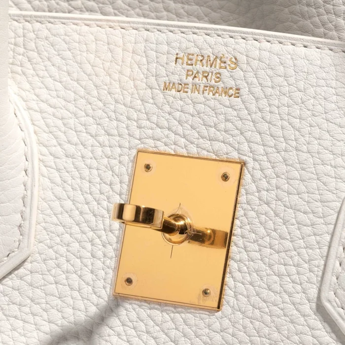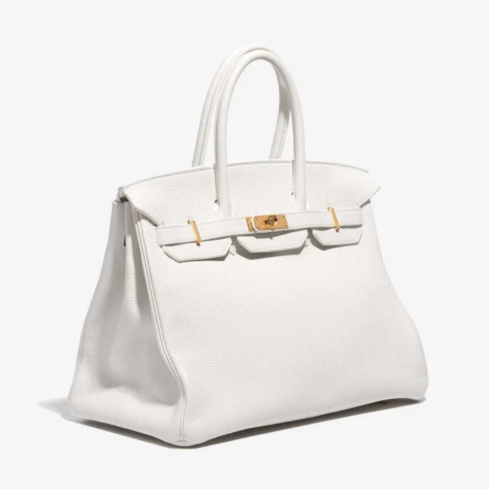 This Hermès Artisan-Grade Birkin 35 features Togo Blanc leather for a pristine and elegant white in a larger size with gold hardware. Gold hardware adds a warm and classic touch. Very spacious, ideal for carrying more essentials. Togo leather is durable and has a lovely, natural grain. Carry it by the top handles or on your arm for a chic and timeless statement. Ideal for work, travel, and everyday elegance.