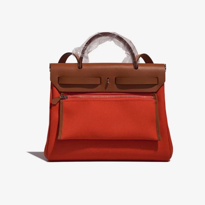 This Hermès Artisan-Grade Dupes Herbag 31 features Toile Militaire (military green canvas) and Vache Hunter leather in a rugged and stylish combination of Mecano (bright orange) and Fauve (tawny brown) accents with palladium hardware. Palladium hardware provides a modern and practical finish. Sized to hold your wallet, tablet, and small essentials, with an interchangeable pouch. Toile is durable and lightweight, with Vache Hunter leather accents. The earthy and vibrant colors create a unique and adventurous look. Ideal for daily use and adding a touch of utilitarian chic.