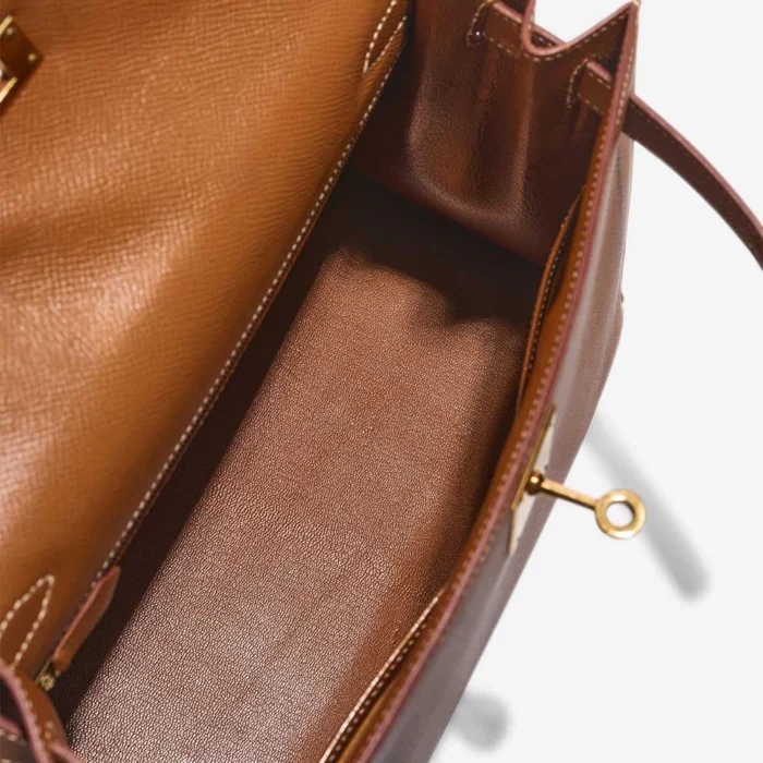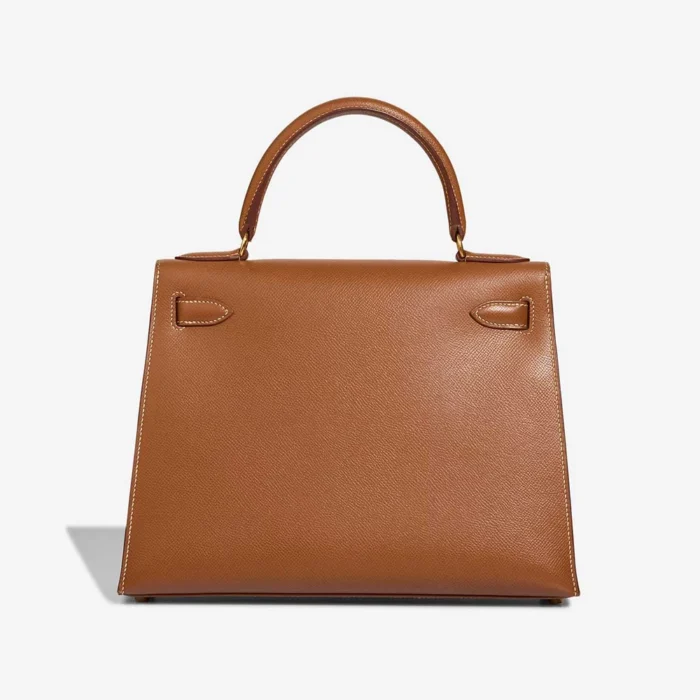 This Hermès High-End Inspired Kelly 28 uses Gold Courchevel leather for a warm, old-fashioned feel. Gold hardware makes the bag look classic and shiny. Spacious enough for daily must-haves like a tablet and cosmetics. Courchevel leather is strong with a special, nice texture. Wear with brown colors or bright, fun outfits. Perfect for daytime fun and looking fancy. Old-school style that always looks good.