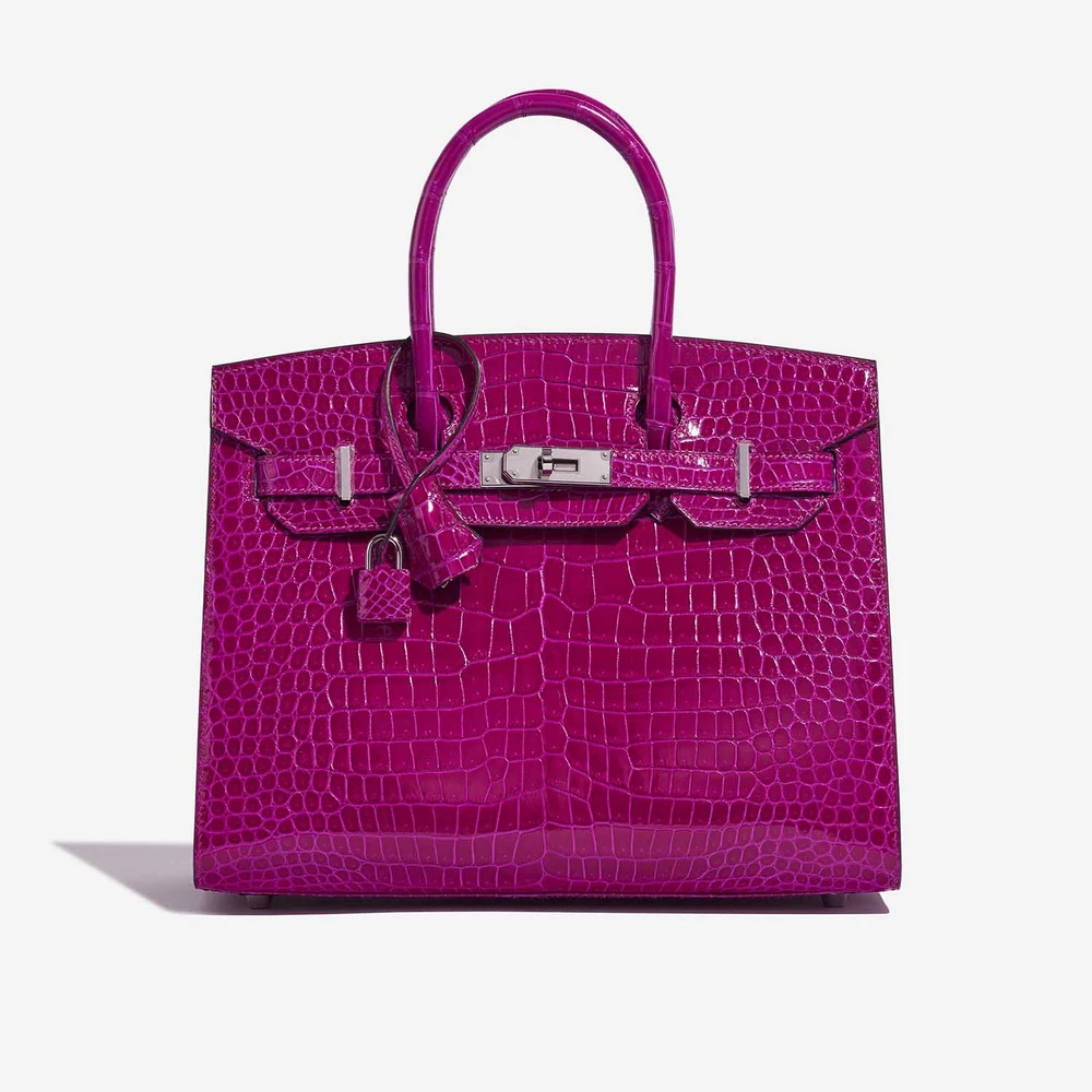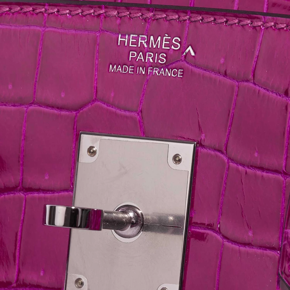 This Hermès Premium Replica Birkin 30 features luxurious Porosus Crocodile Rose Pourpre leather for a rich and vibrant deep pink-purple exotic skin in a versatile size with palladium hardware. Palladium hardware provides a modern and sleek finish. Spacious enough for daily must-haves like a tablet and cosmetics. Porosus Crocodile is one of the most luxurious and sought-after exotic leathers, known for its symmetrical scales. Carry it by the top handles or on your arm for a bold and opulent statement. Ideal for special occasions.
