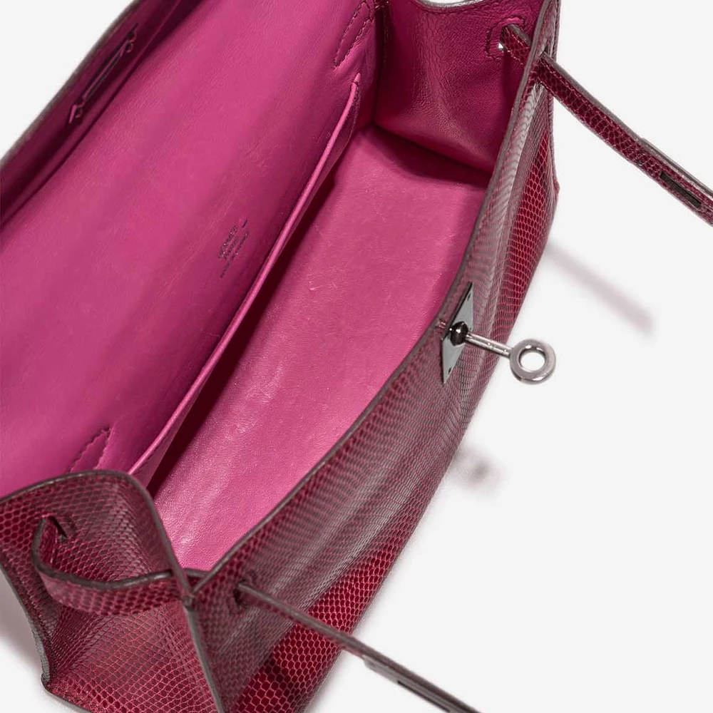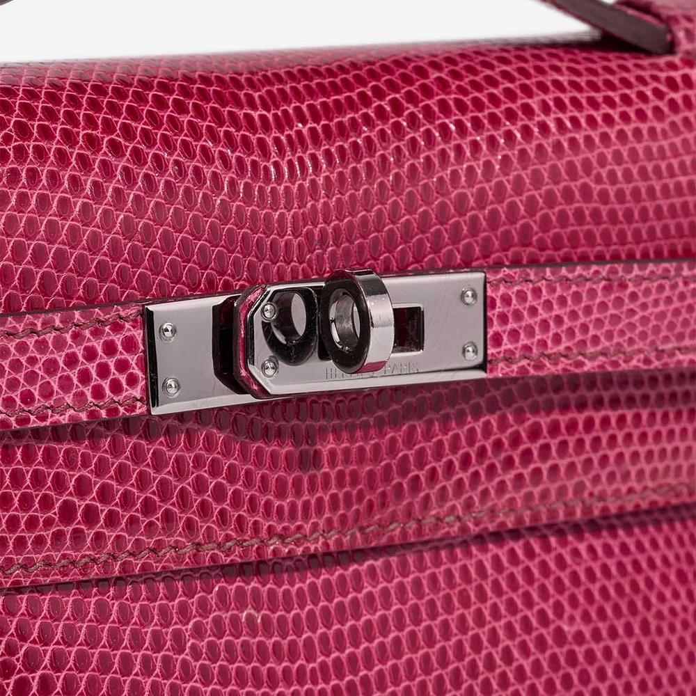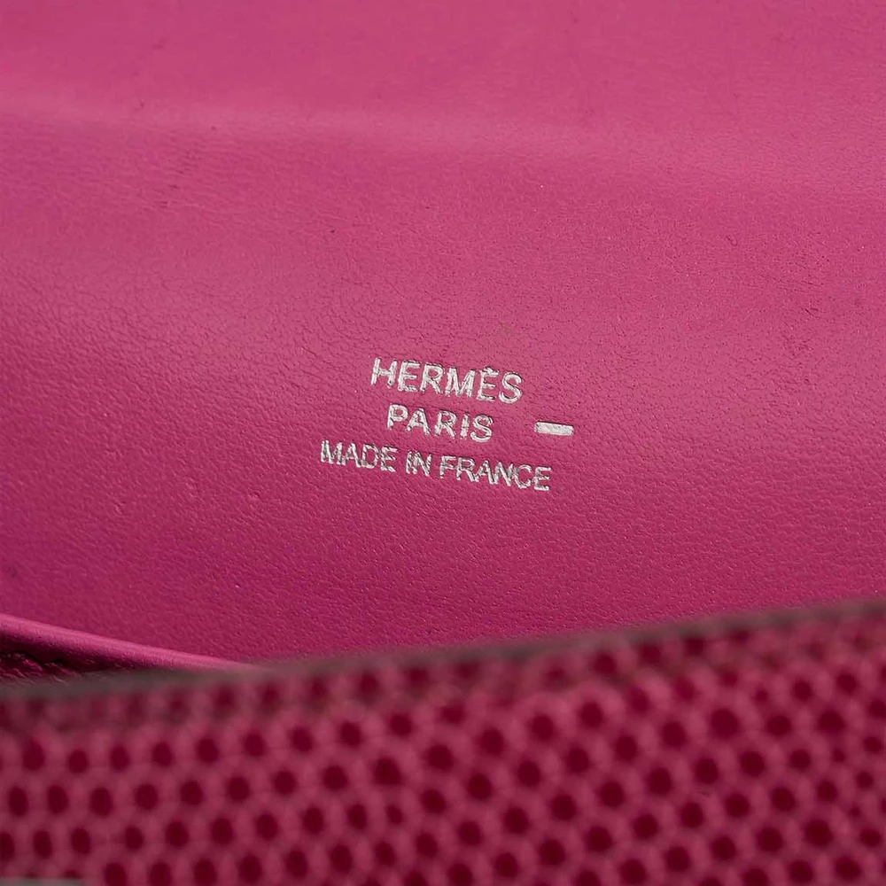 This Hermès High-End Inspired Kelly Pochette features Niloticus Lizard Fuchsia leather for a rare and vibrant hot pink exotic skin in a chic clutch style. Palladium hardware provides a modern and sleek finish. Perfectly sized to carry your phone, wallet, and evening essentials. Niloticus Lizard is prized for its beautiful scales and delicate texture. Carry it in hand for a bold and luxurious statement. Ideal for special occasions.
