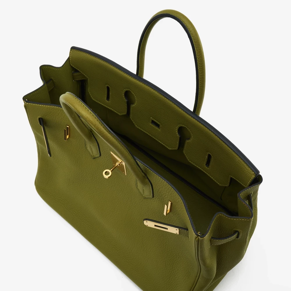 This Hermès Premium Replica Birkin 35 features Togo Vert Chartreuse leather for a vibrant and cheerful chartreuse green in a larger size with gold hardware. Gold hardware adds a warm and classic touch. Very spacious, ideal for carrying more essentials. Togo leather is durable and has a lovely, natural grain. Carry it by the top handles or on your arm for a chic and bold pop of color. Ideal for work, travel, and everyday elegance.