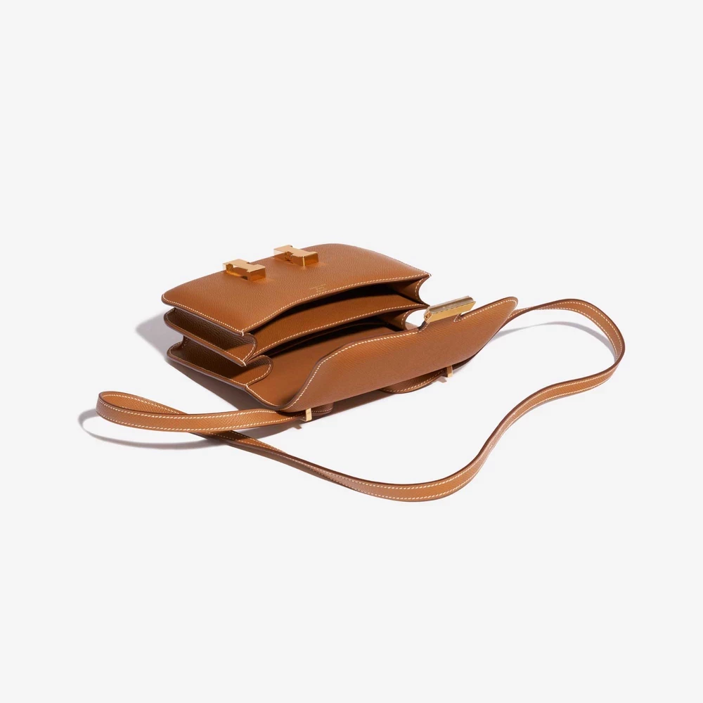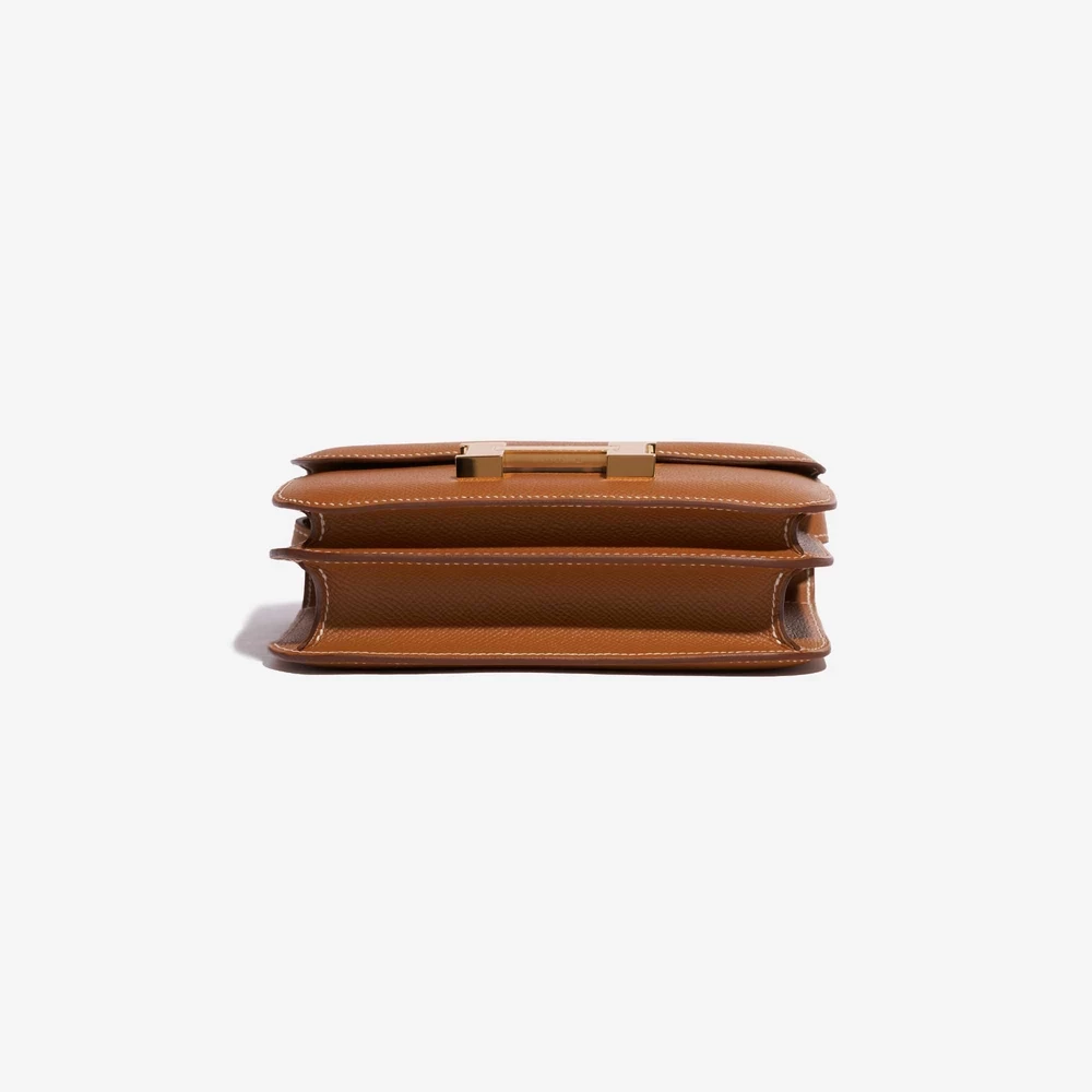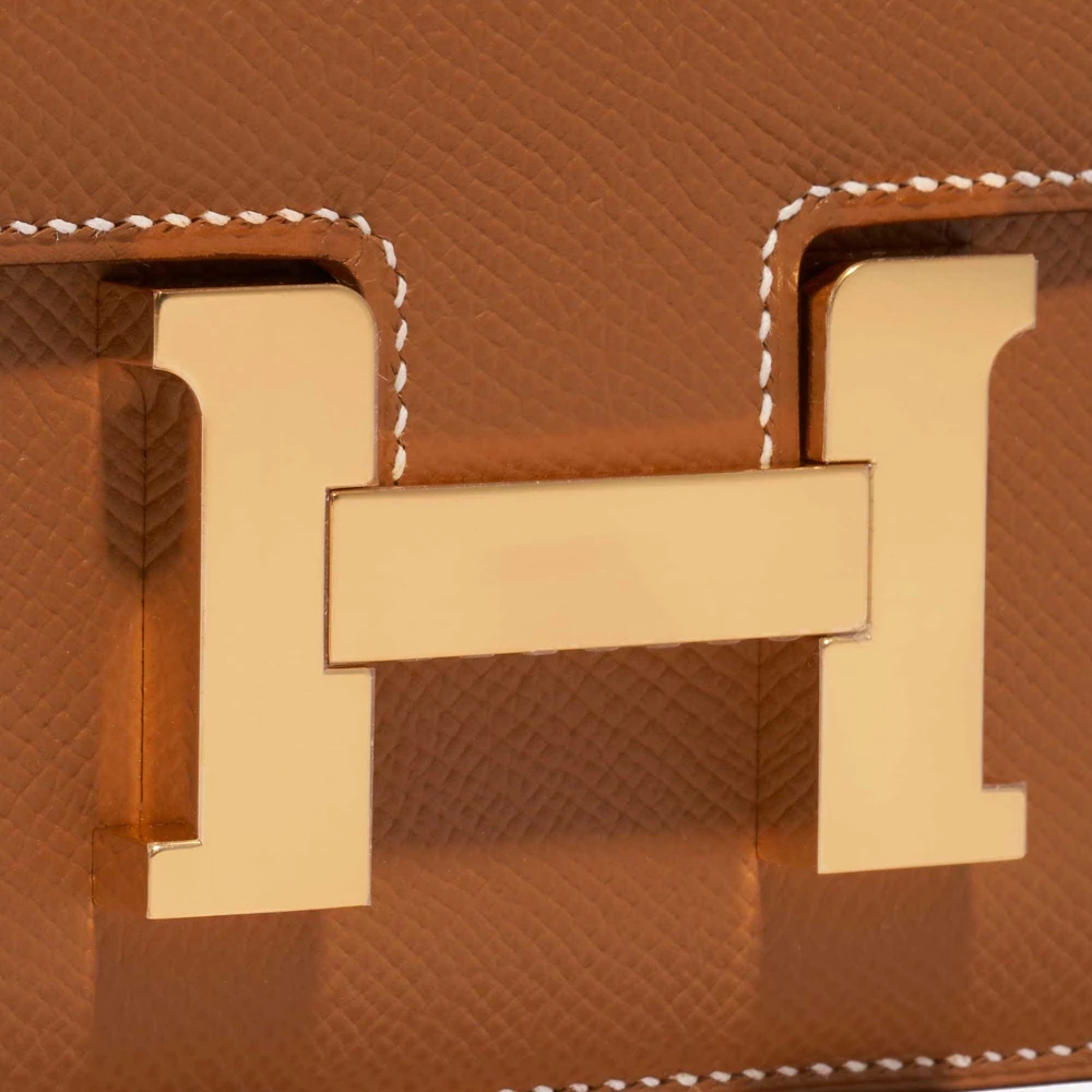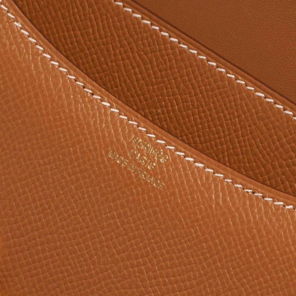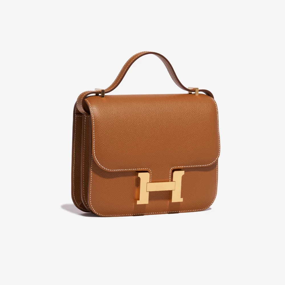 This Hermès Premium Replica Constance 18 features Epsom Gold leather for a timeless and versatile tan in a compact size with a single flap and gold hardware. Gold hardware adds a warm and classic touch. Perfectly sized to carry your phone, wallet, and more. Epsom leather is structured and resists scratches, maintaining its shape. Wear it over the shoulder or crossbody for a chic and timeless look. Ideal for evenings out and special occasions.