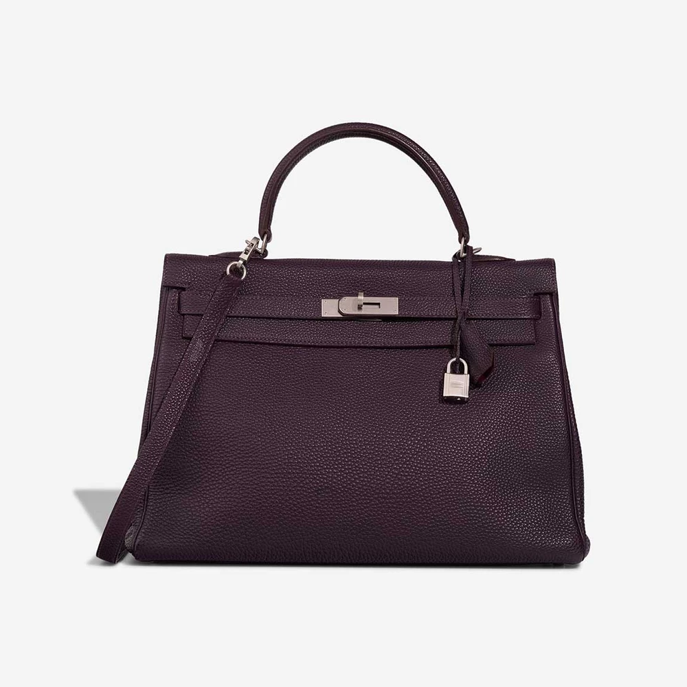 This Hermès-inspired Kelly 35 combines Togo leather in Raisin/Sienne ombré with palladium hardware for tonal drama. PHW frames the turn-lock closure and oversized silhouette. Holds a laptop, notebook, and daily essentials. Pebbled Togo leather resists wear and stays structured. Pair with monochrome outfits or warm hues for autumnal elegance. Ideal for work, travel, or formal events. Depth and dimension in every detail.